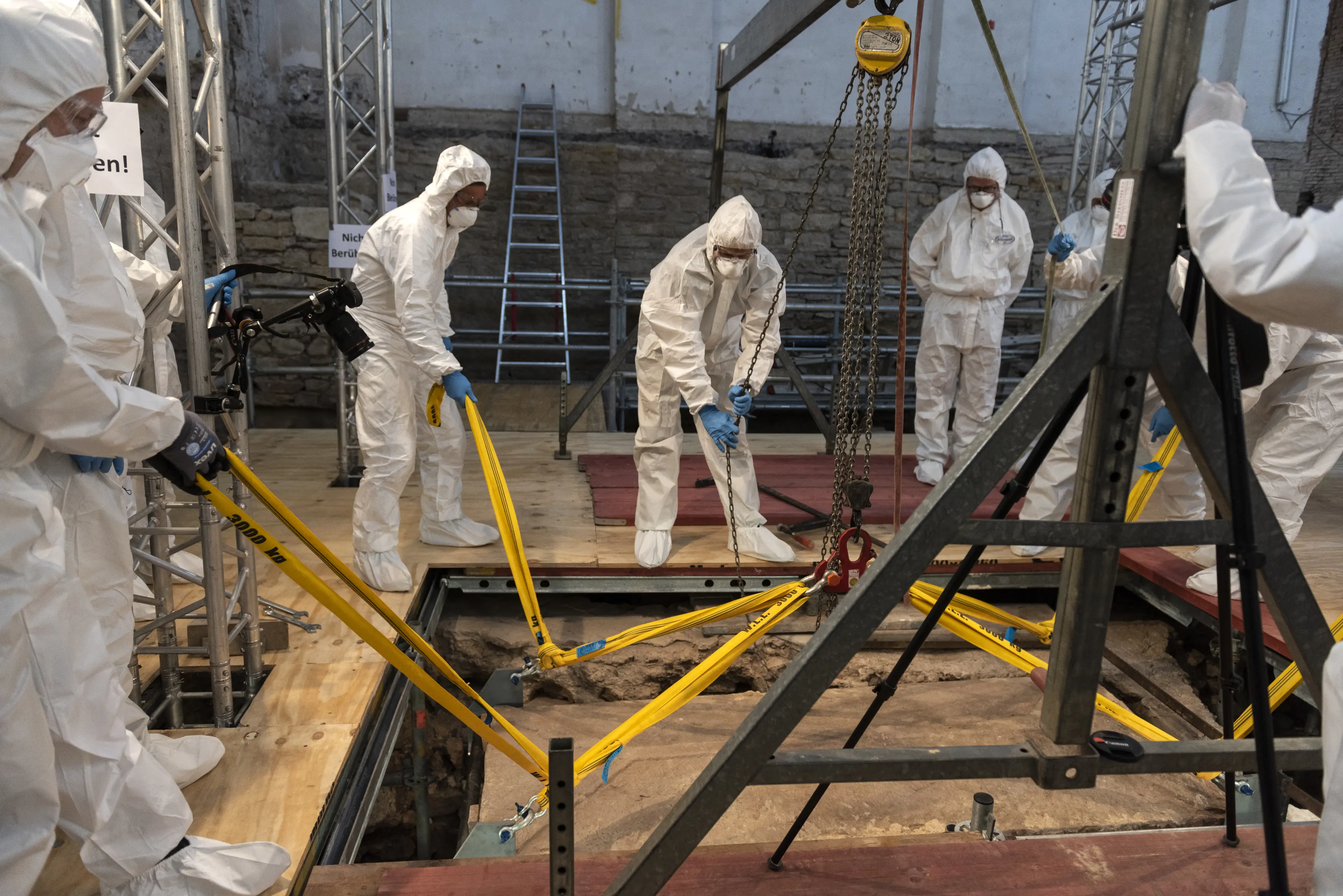 Die Öffnung war ein großes Medienereignis. Ein vierzehnköpfiges Wissenschaftsteam von Archäologen, Anthropologen und Textilwissenschaftlern stand bereit, als sich der Deckel des Steingrabs hob. Die Dombauhütte des benachbarten Mainzer Doms hatte die Hebung des 700 Kilo schweren Sarkophagsdeckels mit einem Hebekran vorbereitet.